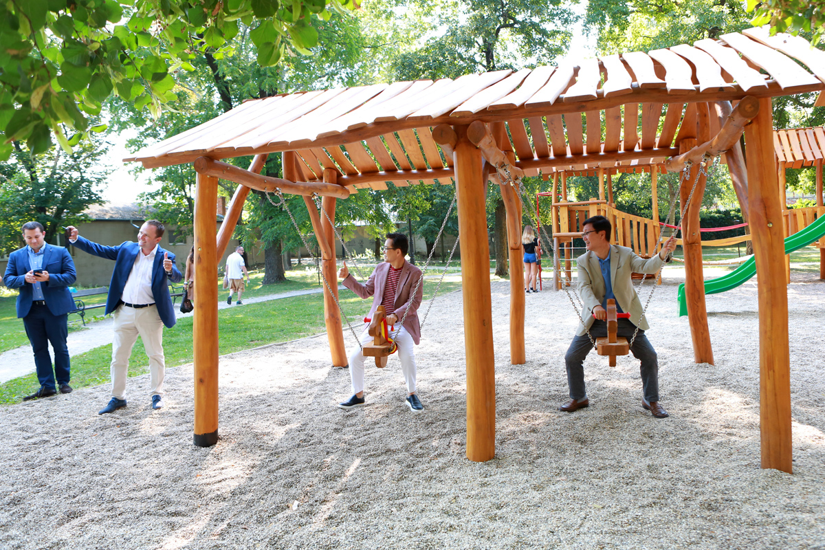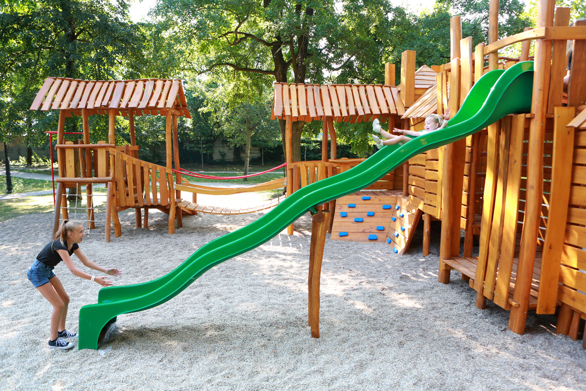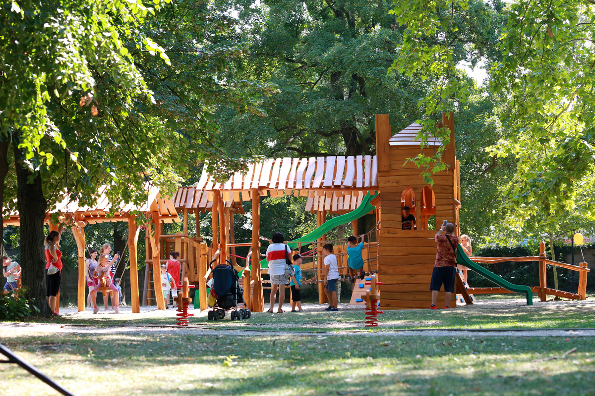 Deti sa konečne dočkali nového ihriska v mestskom parku. Krásna trvácna drevená konštrukcia inšpirovaná budovou kaštieľa má naozaj všetko, čo má kaštieľ - symbolicky severnú aj južnú vežu, na „nádvorie“ ústi obrovská zelená šmýkalka. Na mieste severného krídla, bývalých stajní, sa hojdajú drevené ko