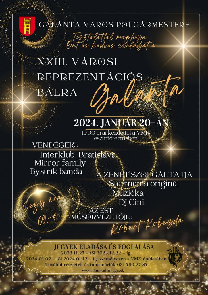 Galánta Város polgármestere szeretettel meghívja Önöket a város XXIII Reprezentációs Báljára, melyre 2024. január 20-án 19:00 órai kezdettel kerül sor. Helyszín: a Galántai Városi Művelődési Központ, belépődíj: 69 euró.