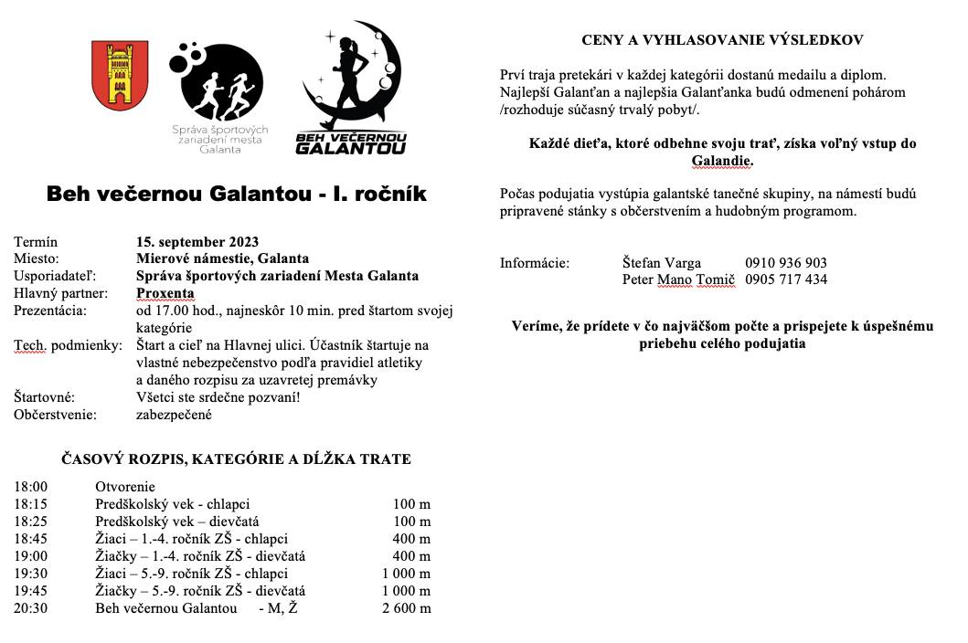 Správa športových zariadení Mesta Galanty v spolupráci s mestom Galanta srdečne pozývajú všetkých Galanťanov na I. ročník podujatia Beh večernou Galantou, ktorý sa uskutoční