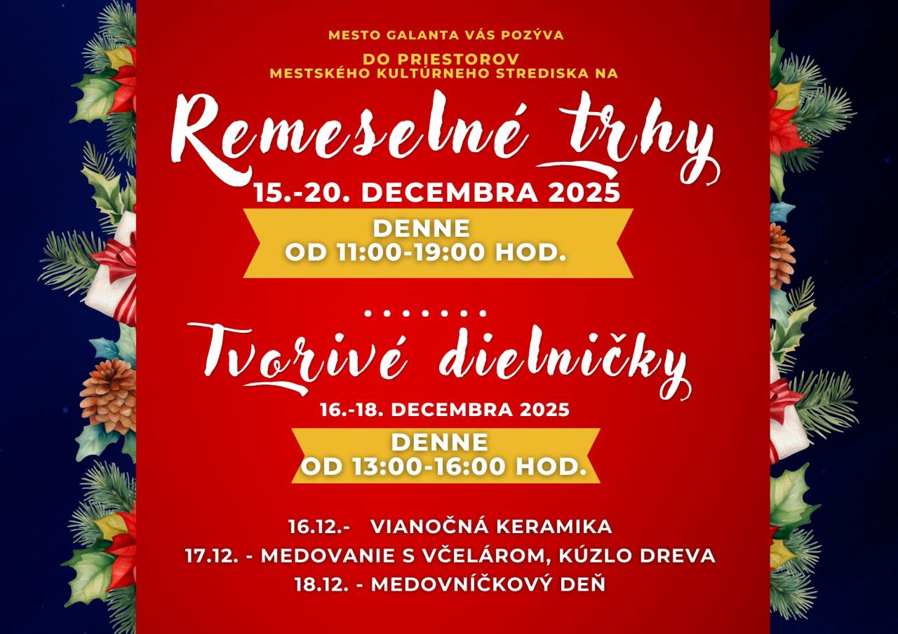 REMESELNÉ TRHY, ktoré sa začínajú už 15. decembra. Navštíviť ich môžete počas šiestich dní, denne od 11:00 do 19:00.